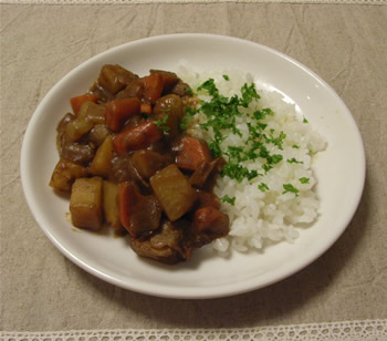 3.全体に油が回ったら、水1カップを入れて、沸騰させ、そのあと弱火で、野菜がやわらかくなるまで煮る。