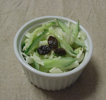 2.ドレッシングの材料を全て混ぜ、1とレーズンを入れてかき混ぜる。