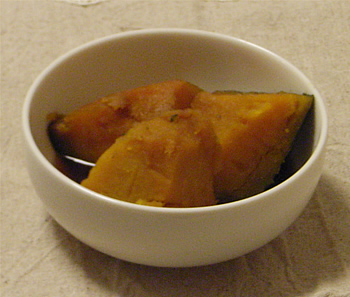 冷凍かぼちゃを鍋に入れ、半分隠れる程度に水を入れて、しょうゆ、みりんを入れて、煮る。