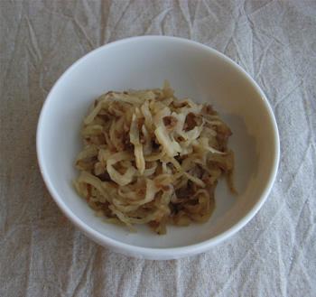 (2)鍋に水と切干大根、砂糖、しょうゆ、酒、みりん、かつおぶしを入れて、ひたすら煮る。途中、味を見て調味料を足す。
