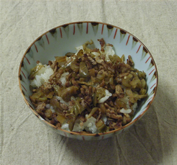 4.ザーサイに火が通ったら、ご飯にのっけて頂く。