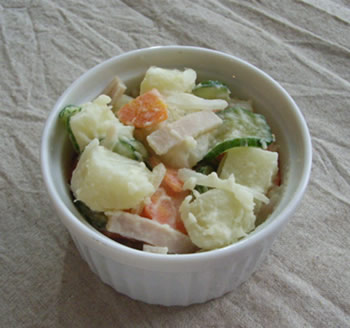 今回のポイントは、じゃがいもとにんじんと玉ねぎをゆでた直後に、フレンチドレッシングであえたことです。