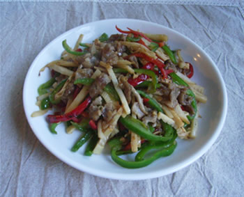 1、 ピーマン、タケノコは5mm幅の縦細切りにする。しいたけは5mm幅に切る。にんにく、しょうがはみじん切りにする。豚肉は繊維に沿って1cm幅に切ってボウルに入れ、片栗粉を加えて混ぜる。