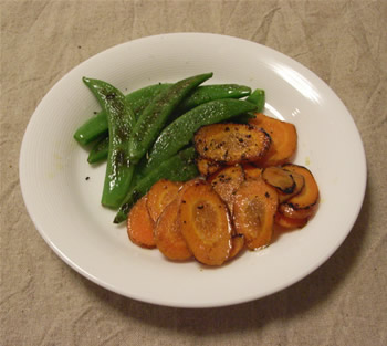 3.フライパンに、オリーブ油を熱し、スナップえんどうとにんじんを入れて炒める。焦げ目が適当に付く程度まで炒めたら、塩、粗びき黒コショウをガリガリ轢く。