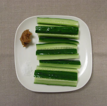 きゅうりをスティック状に切り、ただ、粗塩や味噌をつけて食べるだけ。