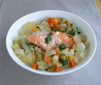 4.器にご飯を盛り、鮭をのせ、3の野菜とスープを上からかける。