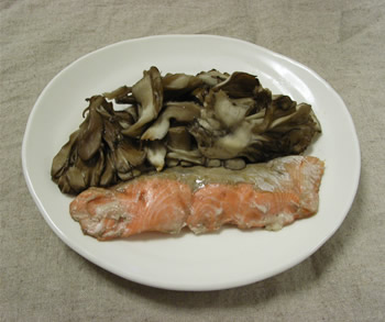 1.アルミホイルを2重に折り、鮭を入れて、酒をふり、マイタケをその上にのせて、ホイルを包む。(ちょっと位空いていたほうがいい)