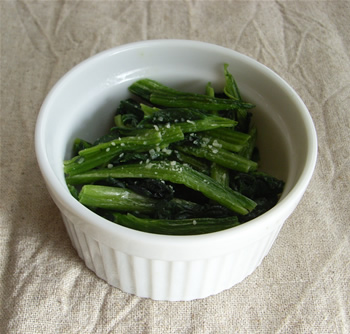 冷凍ほうれん草をオリーブ油でいためて、塩をかけただけ。