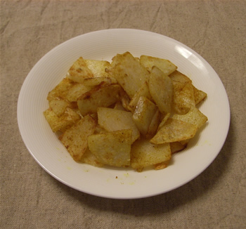 (2)フライパンにバターを熱し、じゃがいもを炒め、焼け目がついたら、カレー粉も入れ、塩で味を整える。