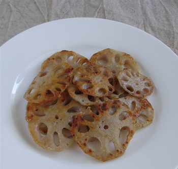 レンコンを薄切りにして、フライパンに少量のオリーブ油を熱して