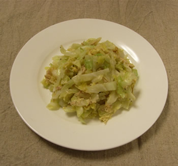 2.フライパンにサラダ油を熱し、キャベツを炒めて、塩・こしょうを振る。続いて、ツナを入れて合わせ炒め、最後に、溶き卵を入れて、全体を混ぜる。