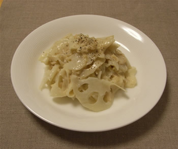3.ボウルに、ドレッシングの材料を全て混ぜ、れんこんをあえる。お皿に盛ったら、白すりごまと、こしょうをふる。