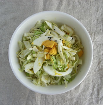 2.ドレッシングの材料を全て混ぜ、キャベツとゆで卵をあえる。