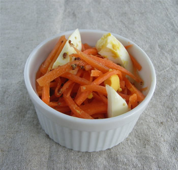 2.粒マスタードと、しょうゆをあわせ、にんじんと卵を加えてあえる。