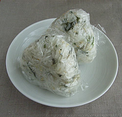 3.ラップを25cm長さ位に切り、手に乗せて、おにぎり1個分のご飯をのせて、形を作ります。(そのまま、冷凍庫で保存できます。)
