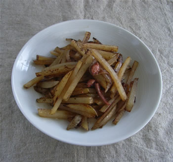 2.フライパンにバターを温め、じゃがいもを入れて、じっくり炒める。じゃがいもが色づいてきたら、塩辛も入れて、炒め合わせ、塩・こしょうで味を調える。