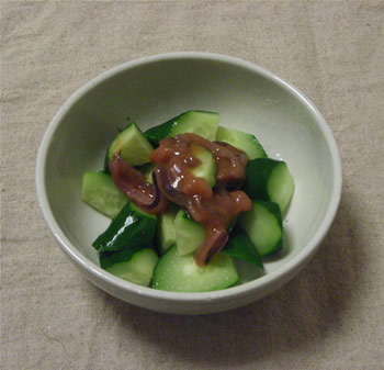 きゅうりを切ったものに、イカの塩辛をあえて、ごま油をかけました。