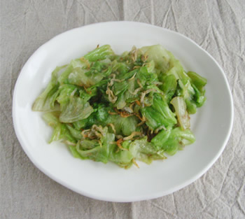 2.フライパンにじゃこを入れ、乾煎りする。カリカリになったら、サラダ油を入れ、レタスを入れて、軽く炒める。