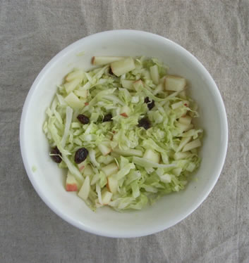 1.キャベツは千切り、リンゴは薄いいちょう切り。