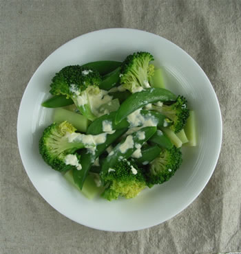 塩茹でしたブロッコリーとスナップえんどうに、マヨネーズ&牛乳のソースをかけただけ。グリーンの色がみずみずしい、春を感じるレシピです。