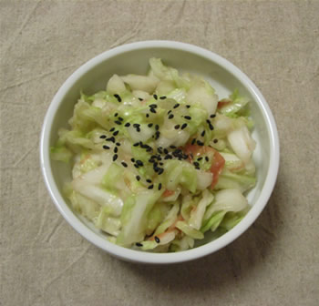 きゃべつを適当な大きさに切り、梅干とともにポリ袋に入れて、もむだけ。しばらくすると、しんなりしてきますから。