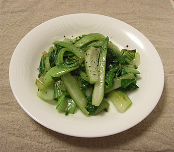 2.フライパンにサラダ油を熱し、にんにくを入れて、香りが立ったら、チンゲンサイの茎を入れて、炒める。しんなりしはじめたら、葉も入れ、塩で味を調える。最後に粗びき黒コショウを轢く。