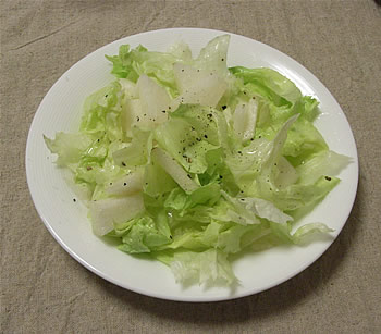 2.器にレタスを盛り、サラダ油をかけて軽く混ぜる。塩、こしょうをかけ、最後に酢をパラパラっとかける。梨を散らす。